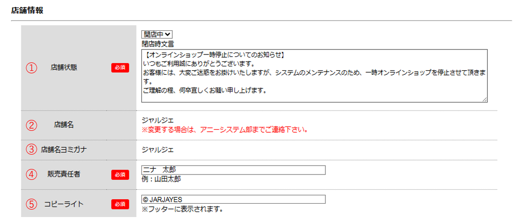 店舗の状態・住所・電話番号などの情報を設定します。