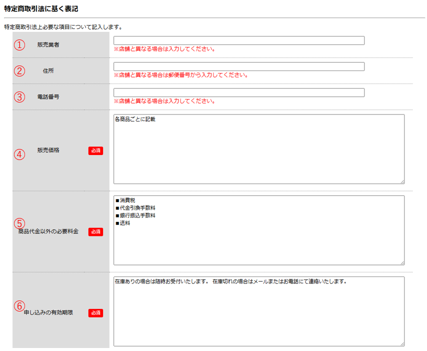 利用ガイドの「特定商取引法に基づく表記」ページに掲載する情報を設定します。