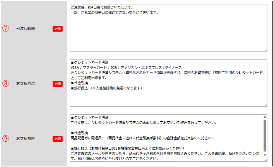 「商品代金以外の必要料金」欄に表示する内容を設定します。