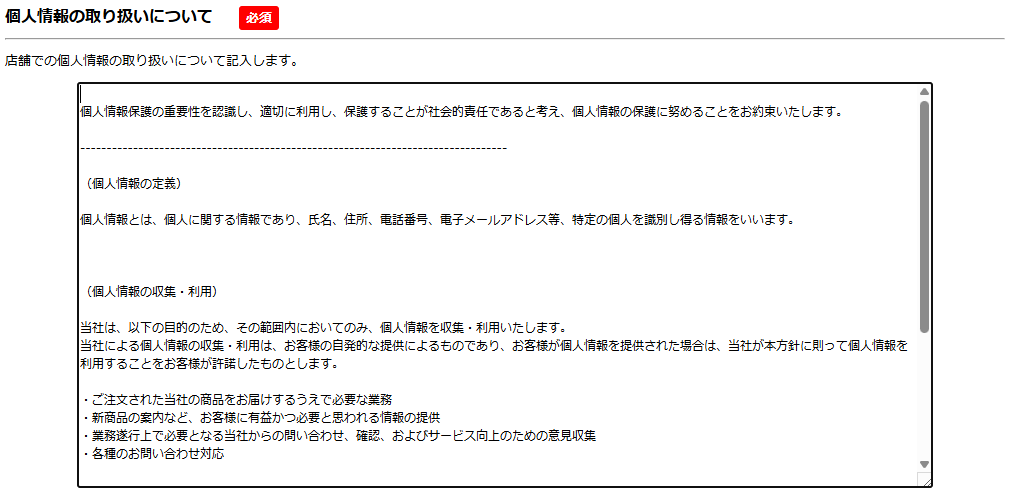 利用ガイドの「個人情報の取り扱いについて」ページに掲載する情報を設定します。