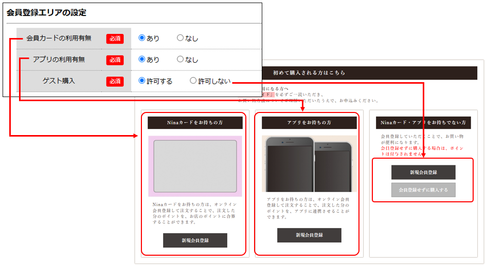 それぞれ「あり」「許可する」に設定することで「会員カードをお持ちの方」「アプリをお持ちの方」の表示/非表示、またはゲスト購入を「許可しない」にすると「会員登録せずに購入」ボタンが非表示になります。