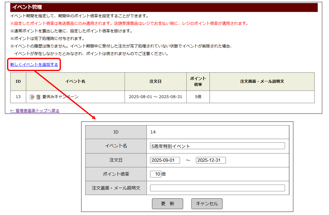 ※イベントの履歴は残りません。イベント期間中に受注した注文が完了処理されていない状態でイベントが削除された場合、イベントが存在しなかったとみなされ、ポイントは倍されませんのでご注意ください。