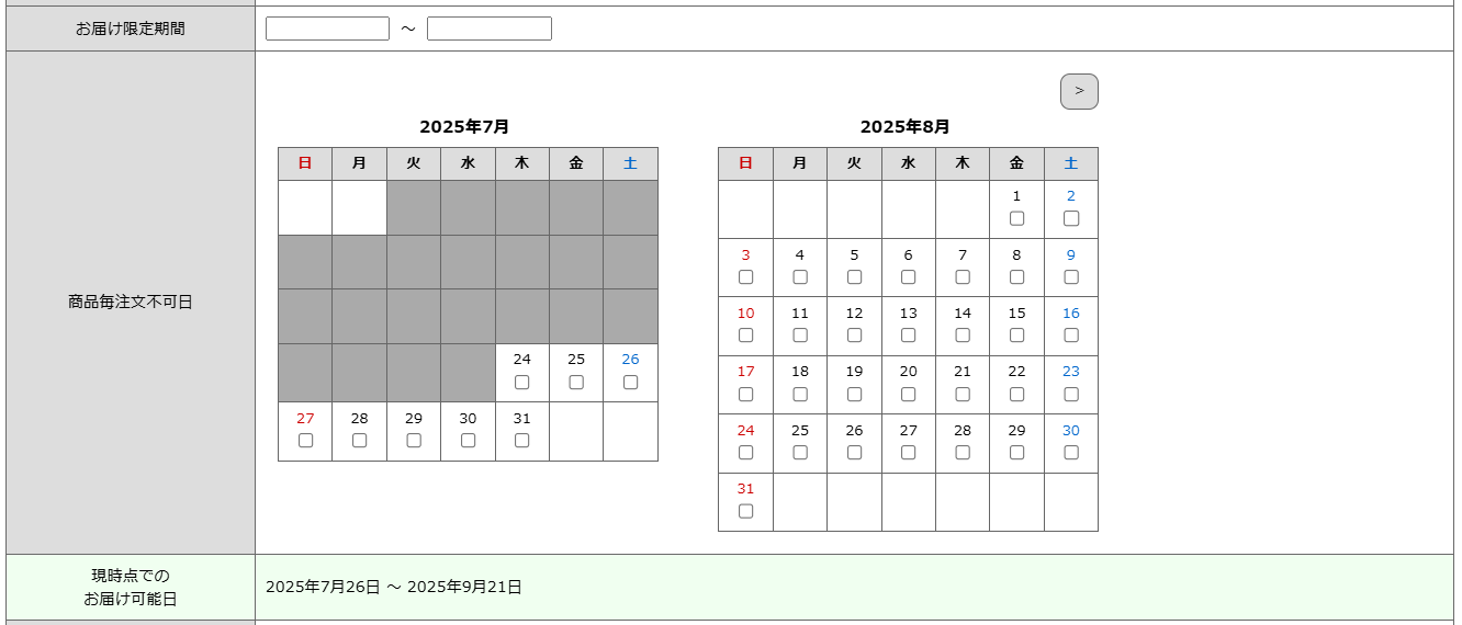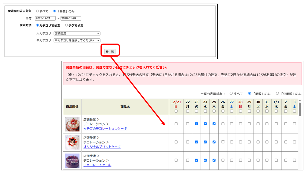 表示されるリストの中から、注文を受けたくない日(発送商品の場合は、発送処理ができない日)にチェックを付けて[更新]を押してください。